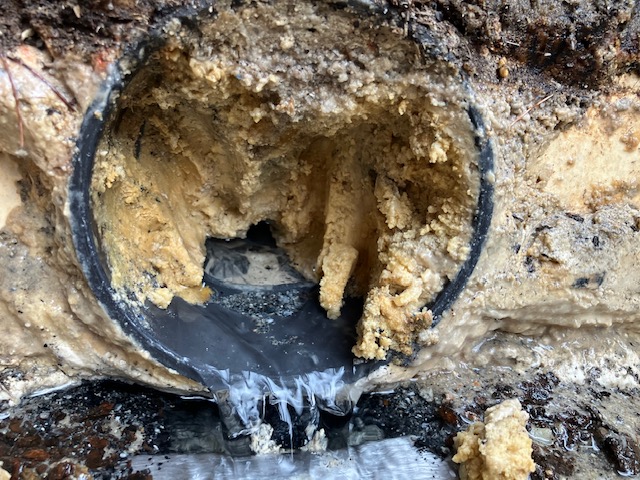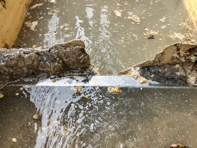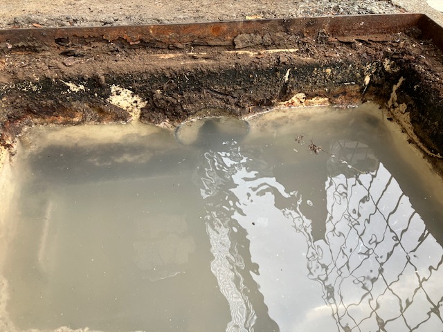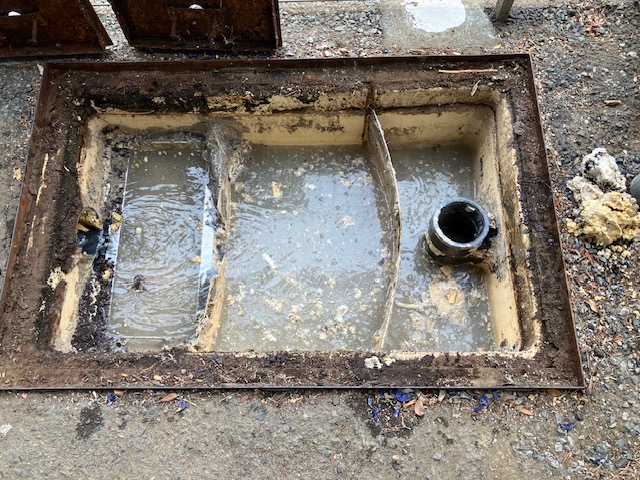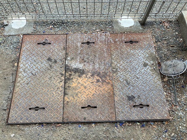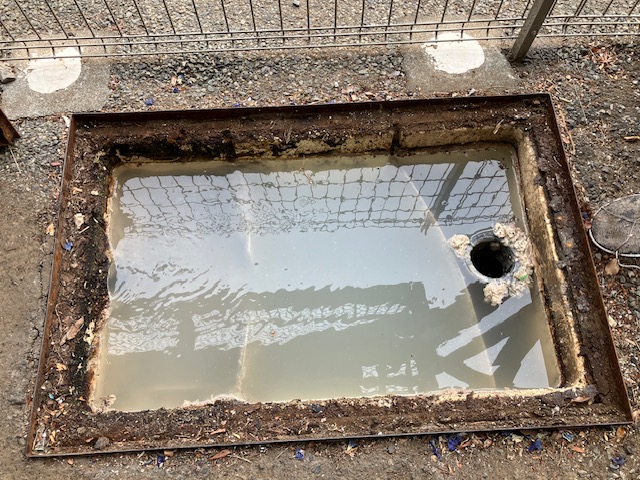 蓋を開けると水位が上昇しており、トラップ管の上部、蓋が欠損した箇所から、かろうじて流れている状態です。